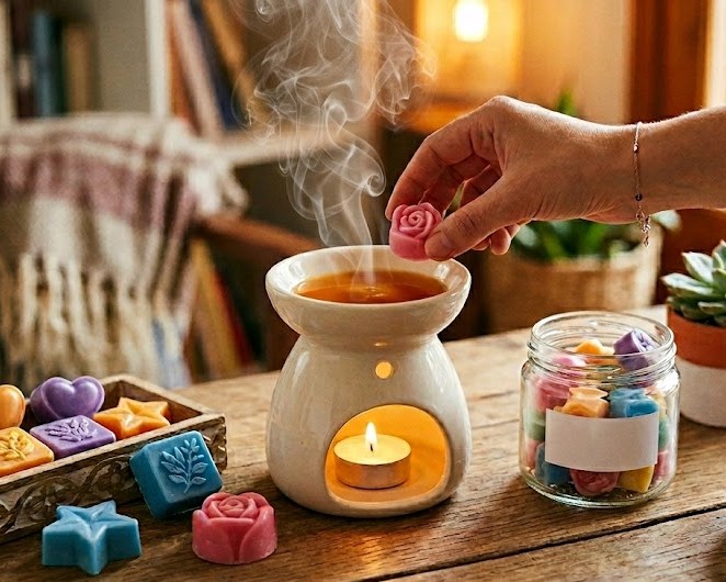 Σκεφτείτε τα wax melts ως “κεριά χωρίς φιτίλι”. Είναι μικρά κομμάτια αρωματικού κεριού που τοποθετούνται στο πάνω μέρος ενός αρωματιστή (καυστήρα). Η διαδικασία είναι απλή: ένα ρεσό λιώνει αργά το κερί, απελευθερώνοντας το άρωμα ομοιόμορφα σε όλο το δωμάτιο.