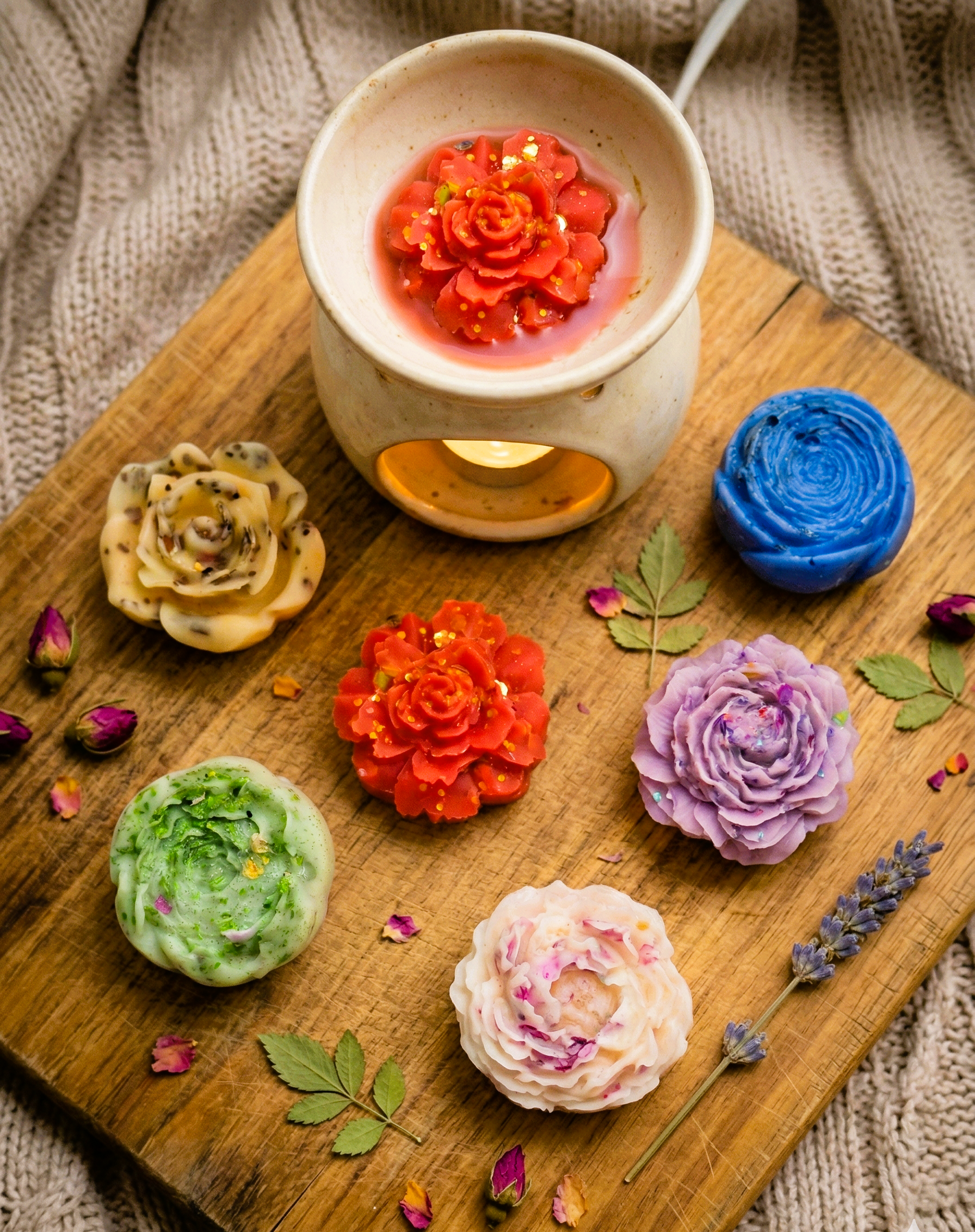 Δεν είναι απλά wax melts. Είναι χειροποίητα αριστουργήματα σε μινιατούρα. Σχεδιασμένα για εκείνους που εκτιμούν την τέχνη σε κάθε της μορφή, τα ανάγλυφα λουλούδια μας αποτελούν την επιτομή της αισθητικής στον αρωματισμό χώρου. Κάθε πέταλο, κάθε καμπύλη και κάθε λεπτομέρεια είναι αποτυπωμένα με απόλυτη ακρίβεια, θυμίζοντας αληθινά άνθη που “πάγωσαν” στον χρόνο για να στολίσουν τον δικό σας χώρο. Κάθε σετ 6 τεμαχίων (~ 55 g) είναι μοναδικό, φτιαγμένο με μεράκι για να προσφέρει την απόλυτη ισορροπία ανάμεσα στην κομψότητα και την αρωματική ένταση.