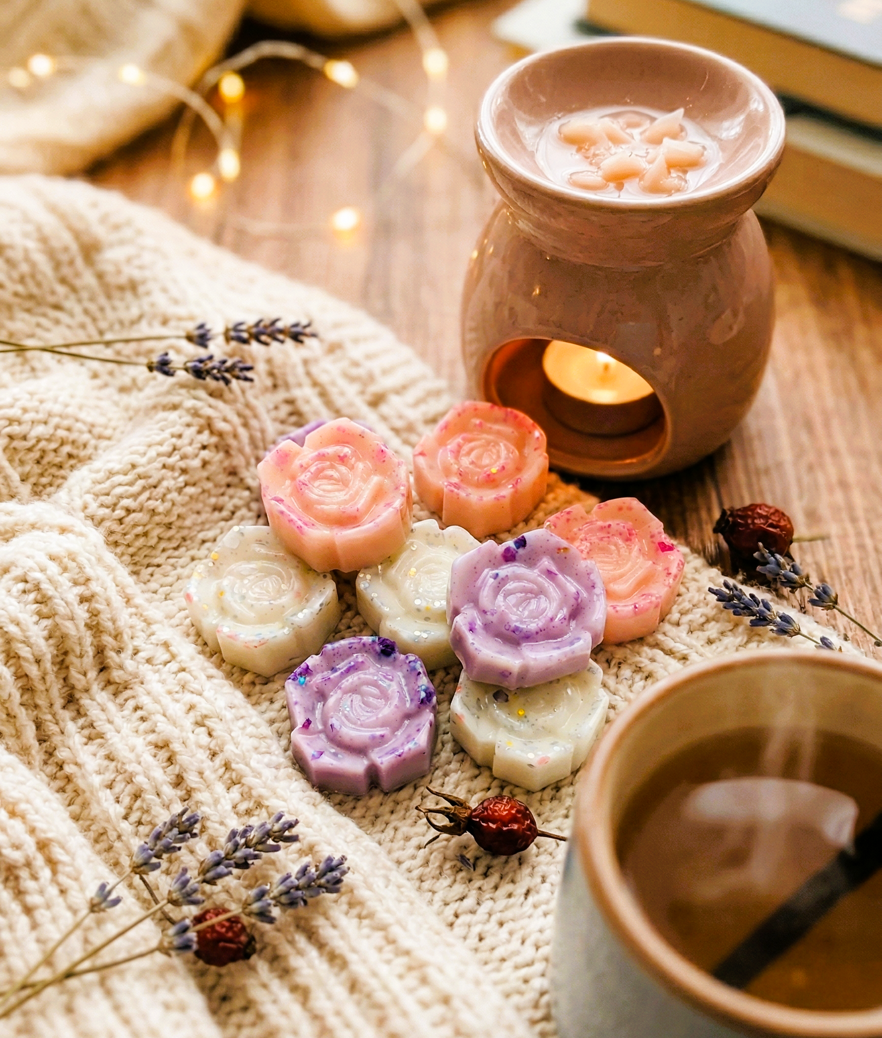 Αφεθείτε στη γοητεία του πιο εμβληματικού λουλουδιού. Τα χειροποίητα Rose Wax Melts (~ 55 g) δεν αρωματίζουν απλά των χώρο· δημιουργούν μία ιεροτελεστία αισθήσεων. Κάθε τριαντάφυλλο είναι μία μικρογραφία τέχνης, πασπαλισμένη με magical glitter που χορεύει καθώς το κερί λιώνει, αποκαλύπτοντας σταδιακά ένα μεθυστικό μπουκέτο αρωμάτων.