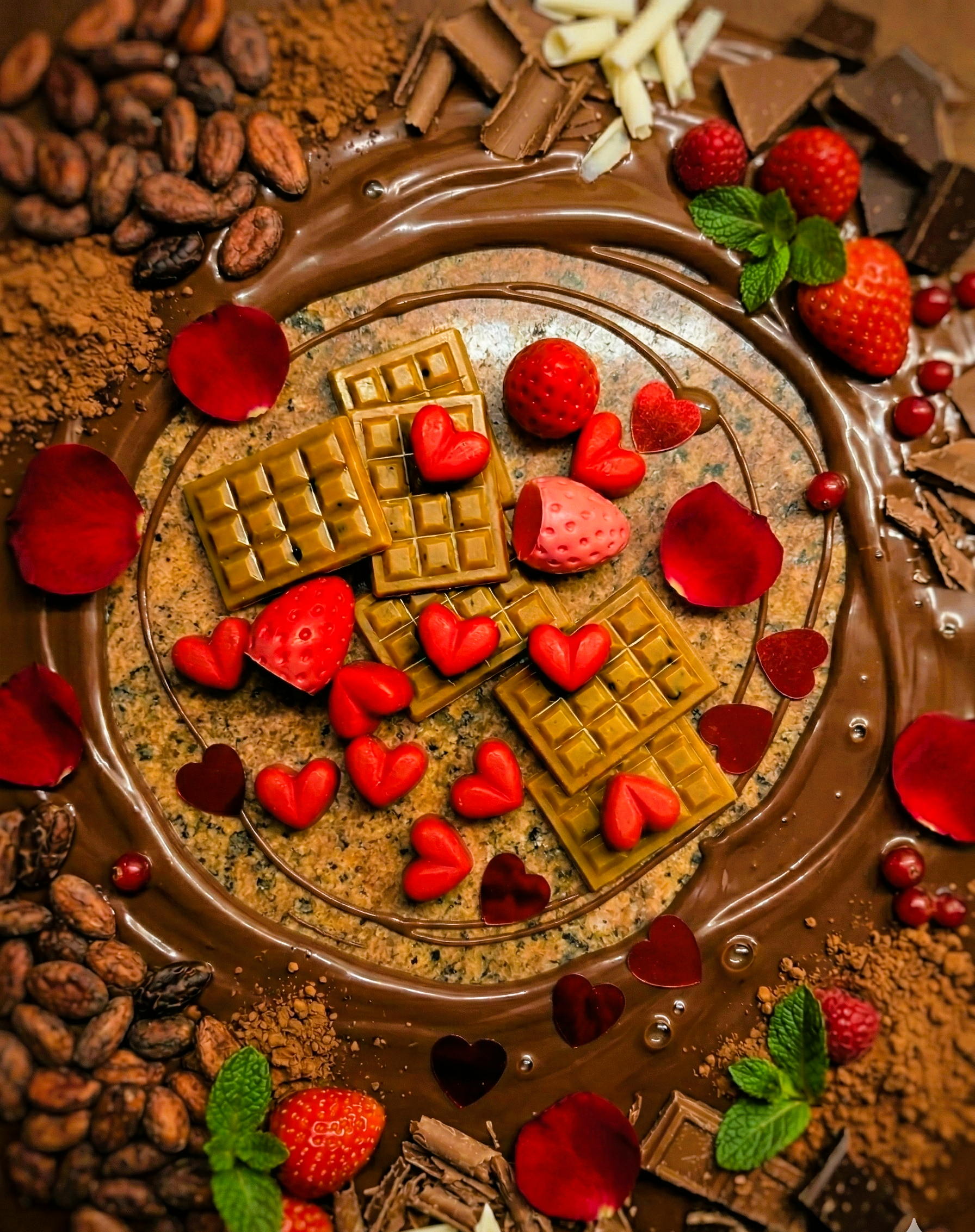 Το σετ περιλαμβάνει: 8 μίνι σοκολάτες, 10 κατακόκκινες καρδιές και 3 ζουμερές φράουλες.